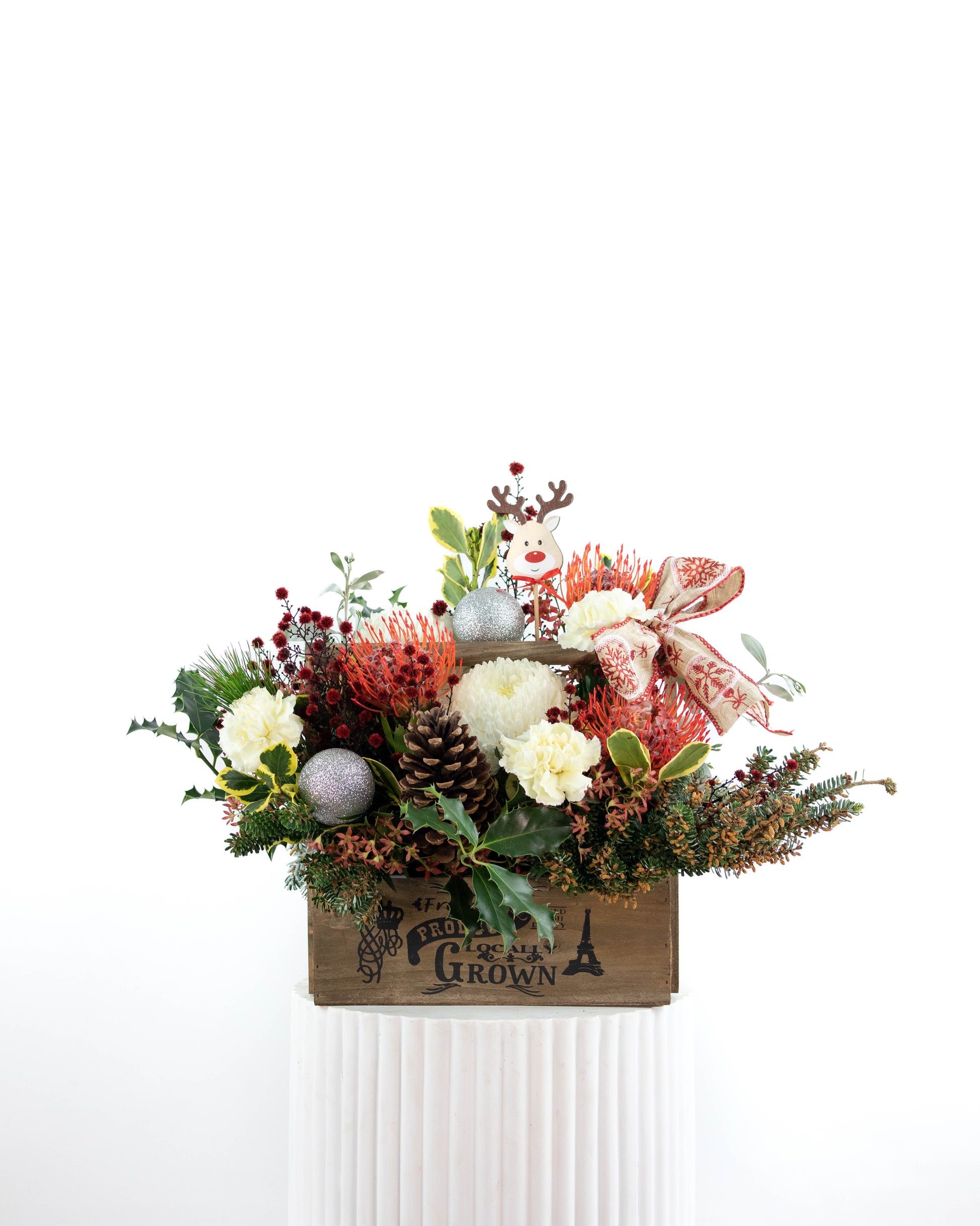 A gorgeous gathering of carefully curated seasonal florals and foliage presented in a wooden boxed style arrangement.