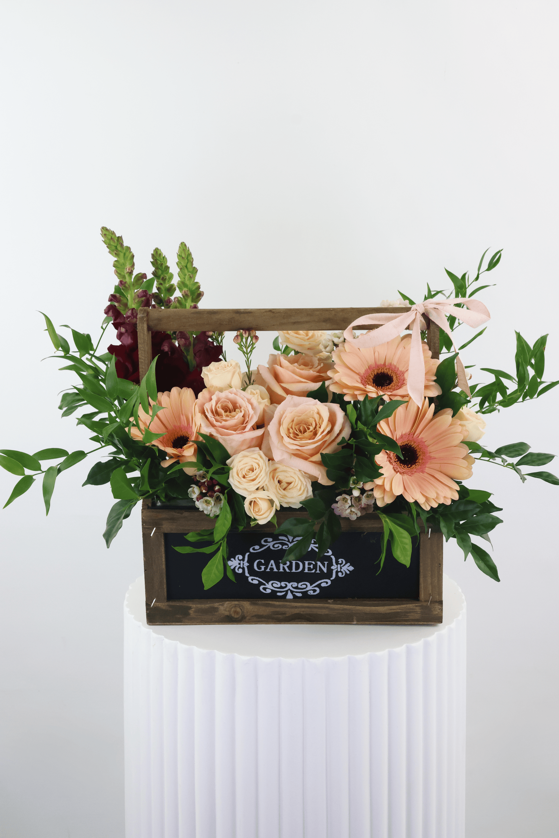 A gorgeous gathering of carefully curated seasonal florals and foliage presented in a wooden boxed style arrangement.