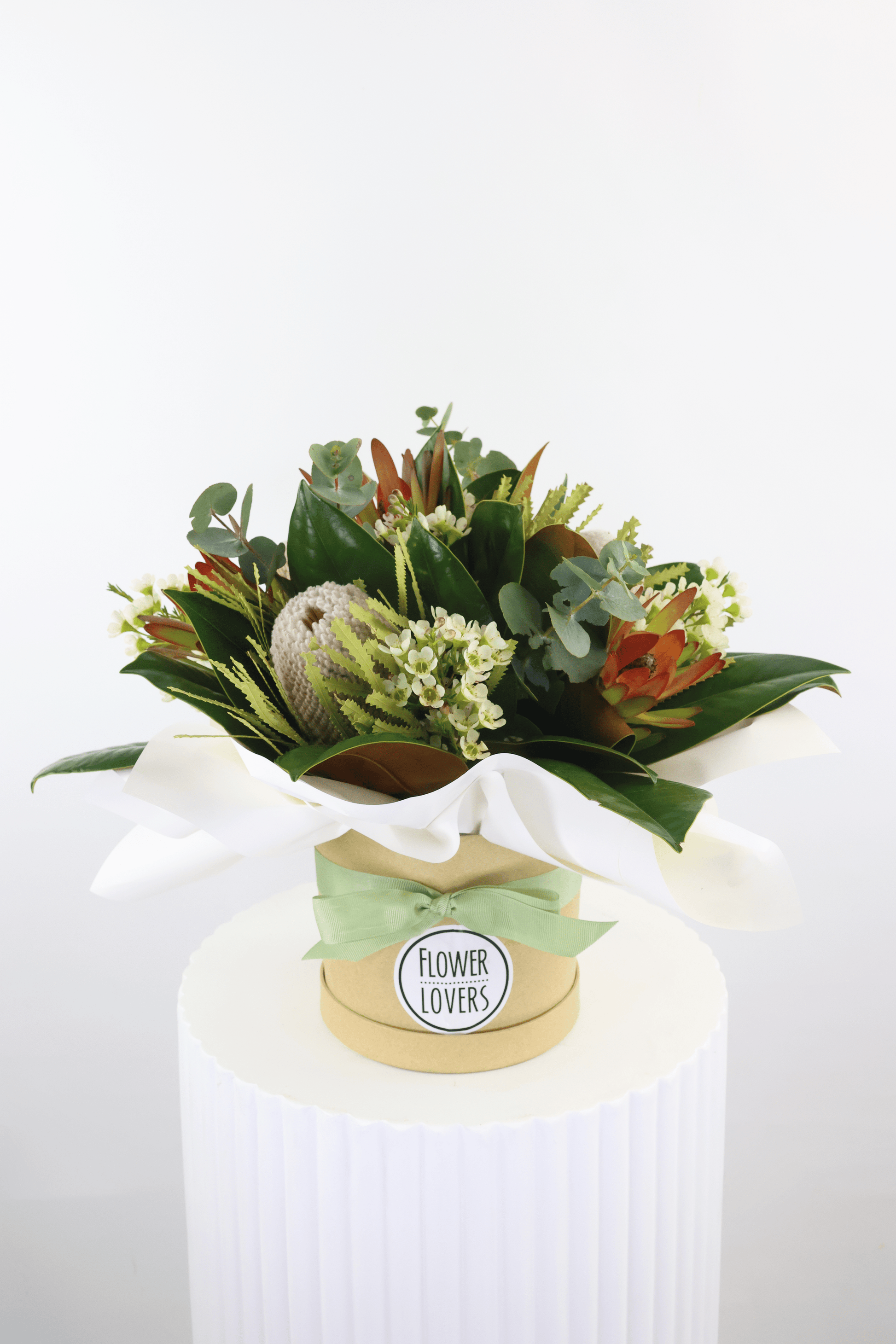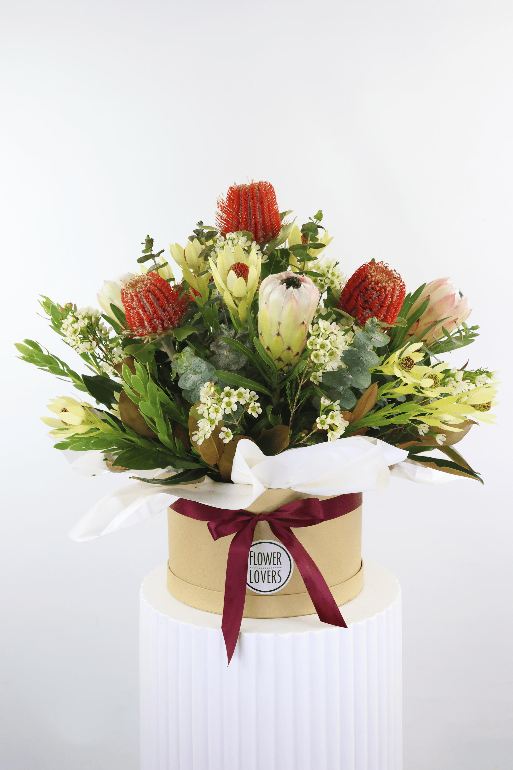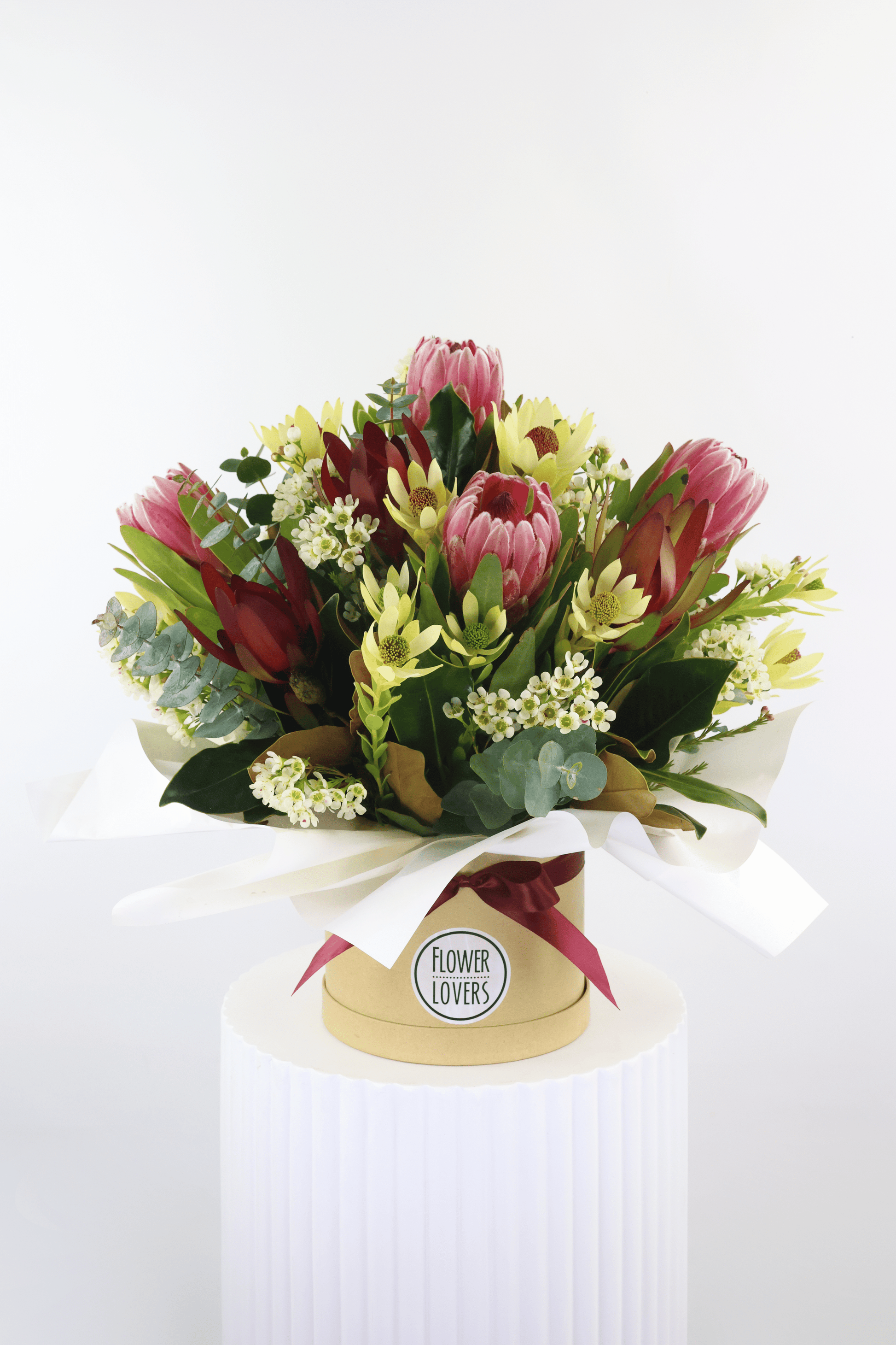 Our signature native arrangement, Wildflowers created using a selection of seasonal native florals and foliages, sensationally styled in a hatbox. Extra Large pictured.